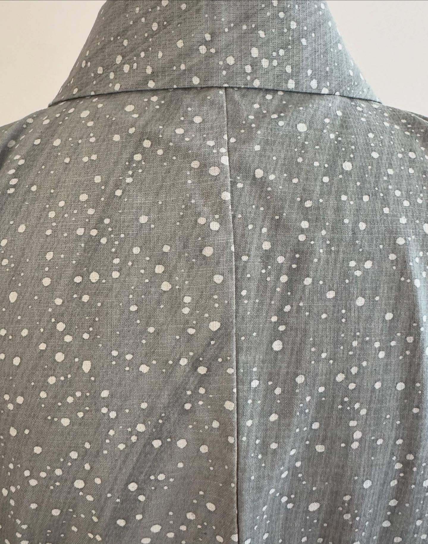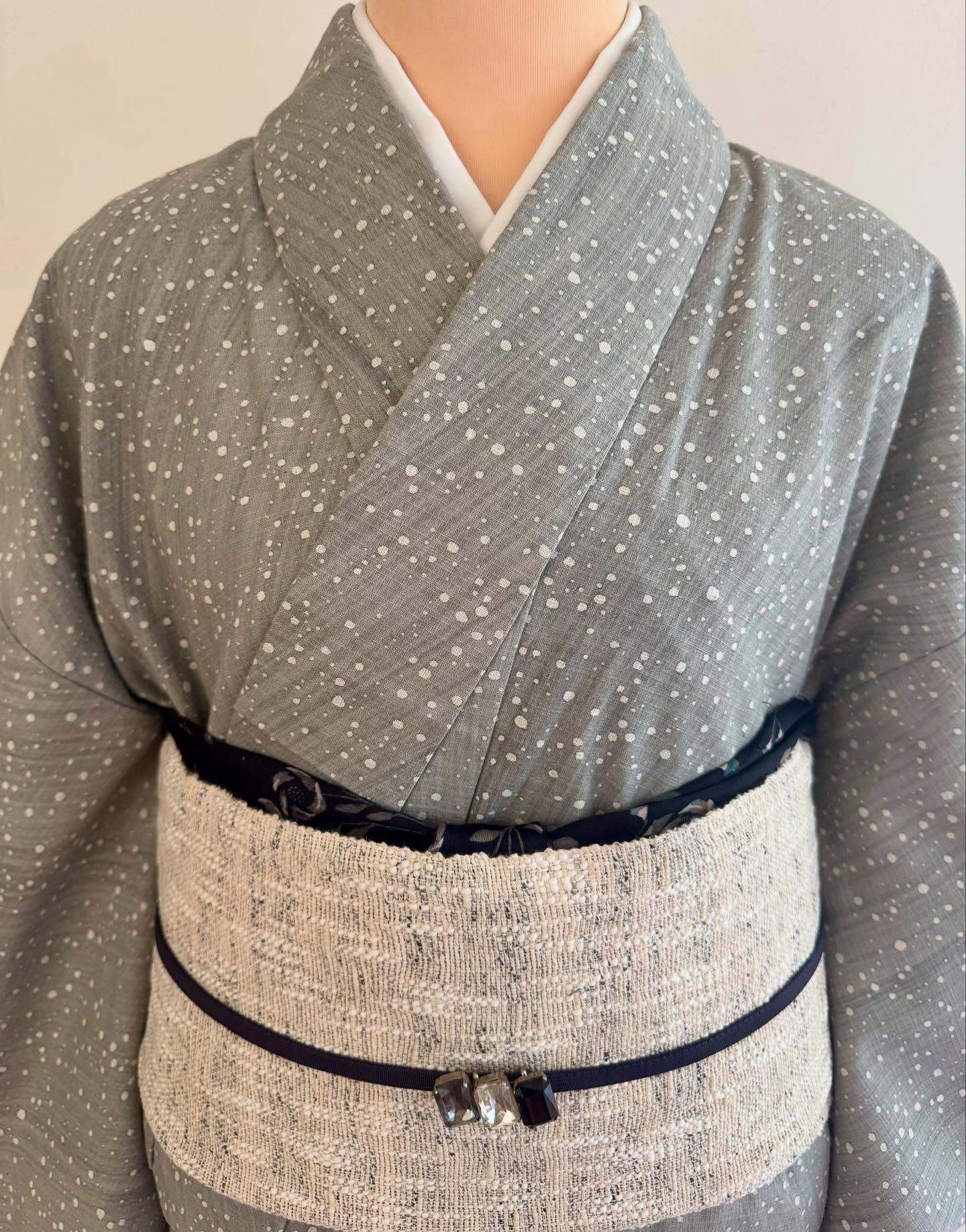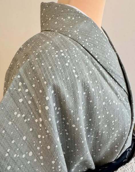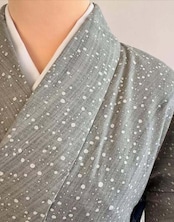 幅の広い刷毛で、グレーの色を斜めにさっと染めたような地に蒔糊ちらし様に大小の霰を白抜きして、まるで天の川のようにも見えます。
