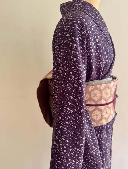 落ち着いた紫の地色は肌を明るく見せてくれます。帯合わせ次第でモダンにもレトロにも表情を変える万能さも魅力的^_^