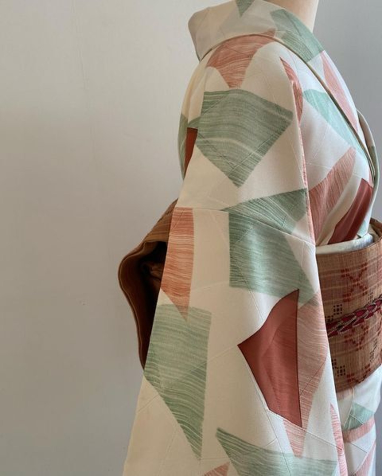 三角の織と染が重なりポップな小紋の着物をご紹介します。