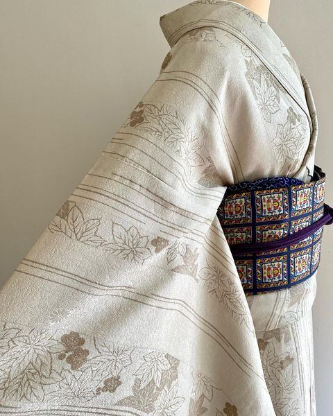 小菊紋ベージュ地にもみじや梅を縦にカラフルな芙蓉や梅や桜を裾に配してます。全体的には小紋に見えますが、裾にさりげなく柄が入ってます。