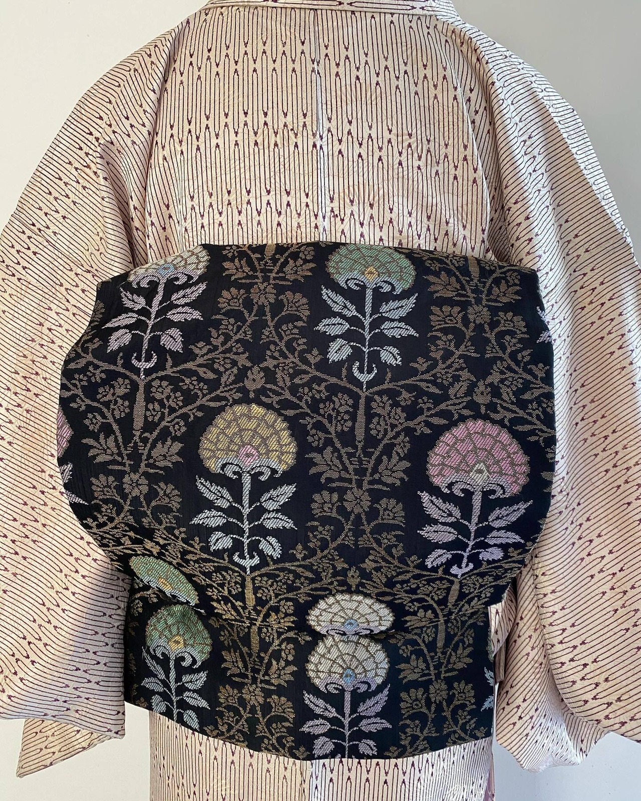 一面に金糸で扇の織出しをしてる生地に杼のような意匠が縦長に紫色の染で施されてます。