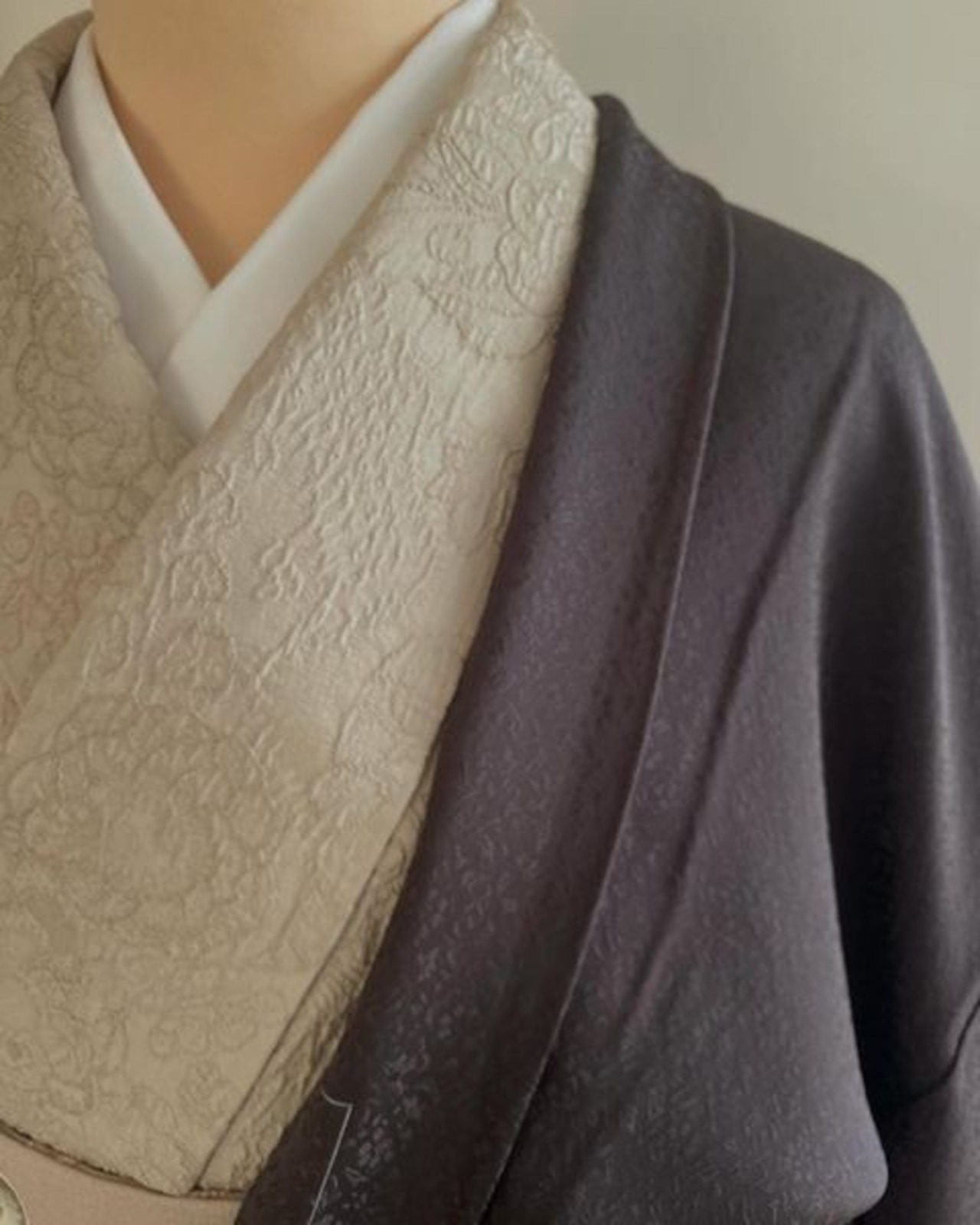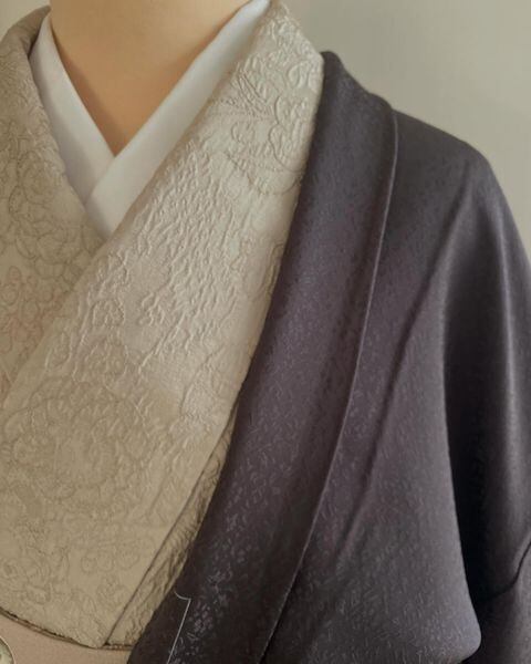 地味色ですが地紋の小花が浮き上がって程よい華があり、さり気なくお着物を引き立ててくれて出番の多い一枚となりそうです。
