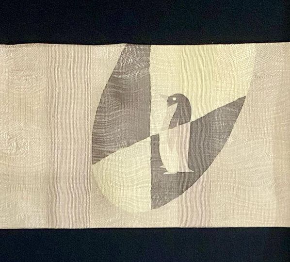 ほんのり灰味の桜色にペンギンの名古屋帯が入荷しましたのでご紹介します。