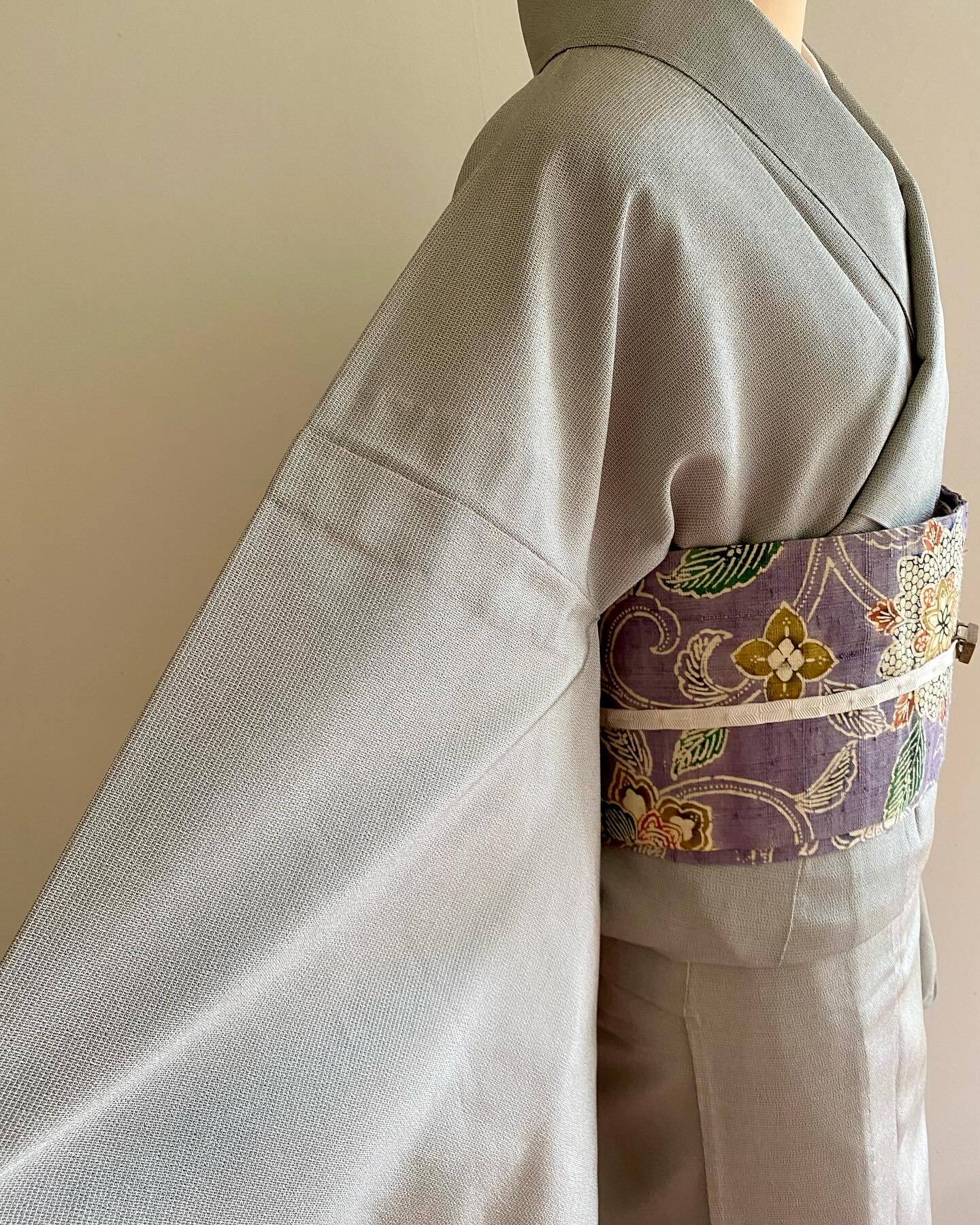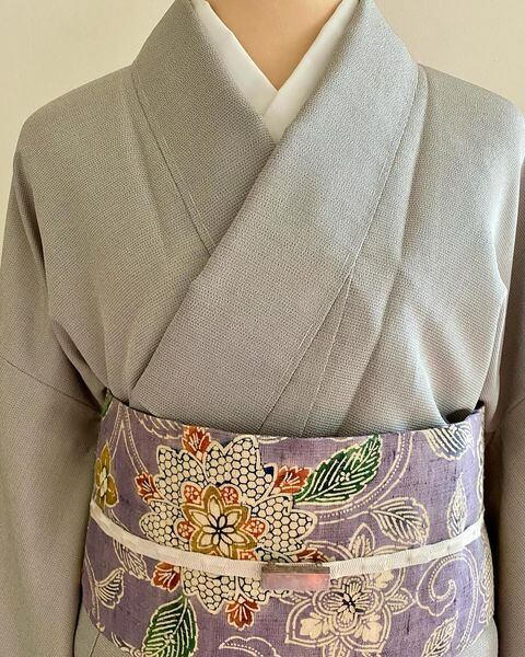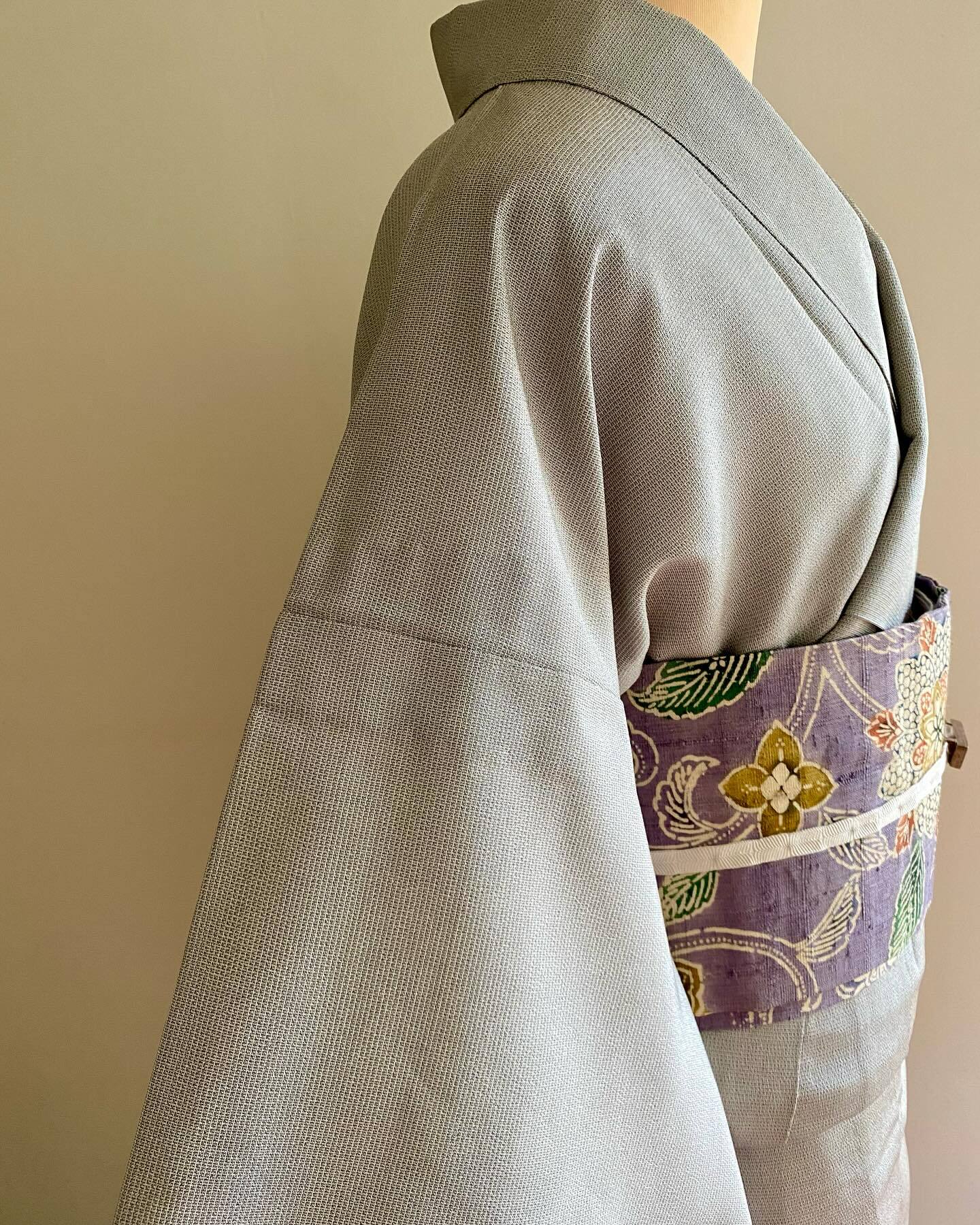 薄紫を台にした生紬型染の帯を合わせてカジュアルシックにしましたが織の帯で少し格高にも仕上げられそうです。