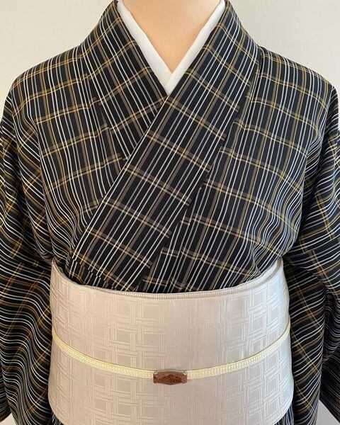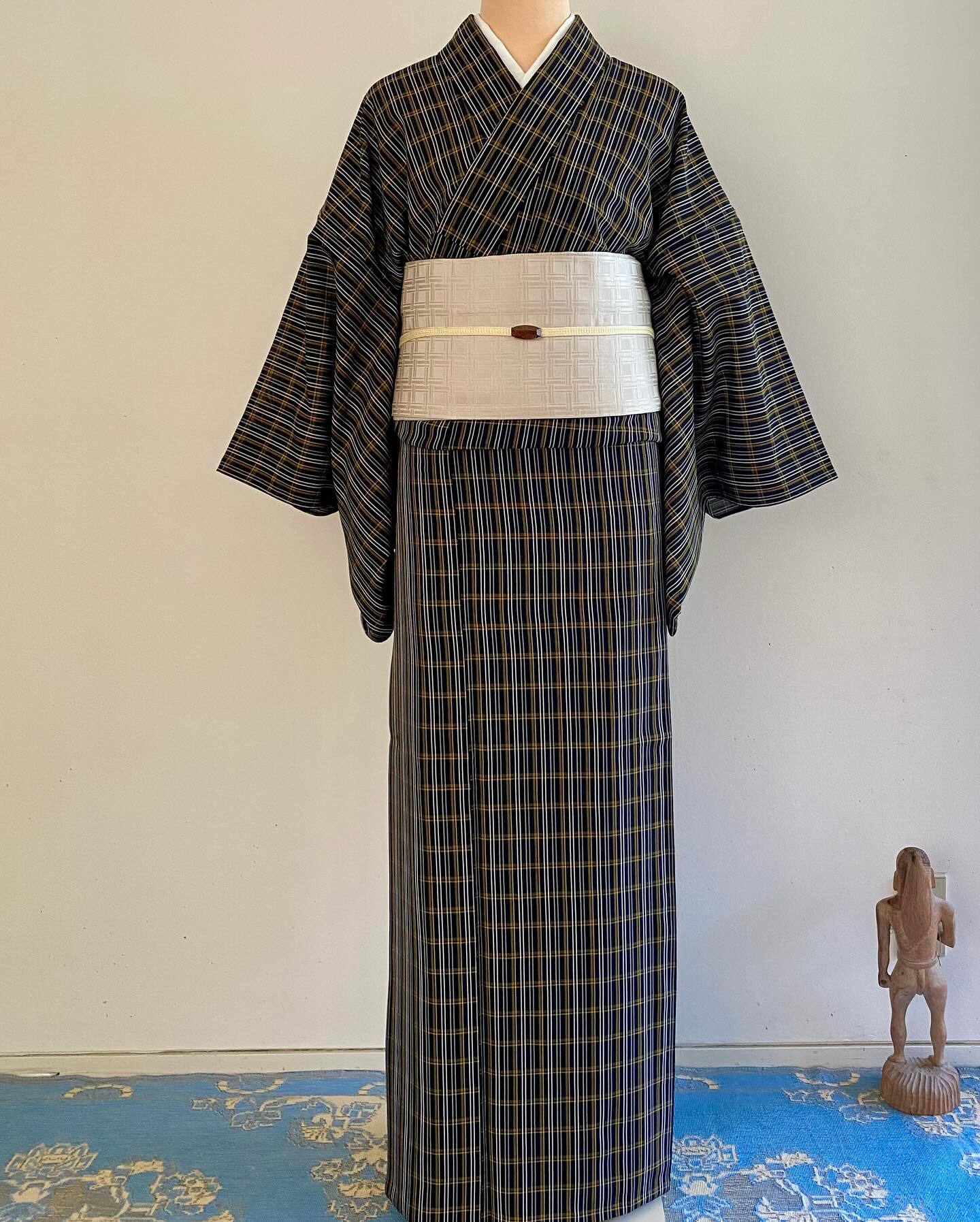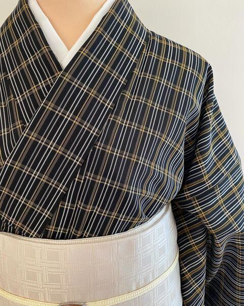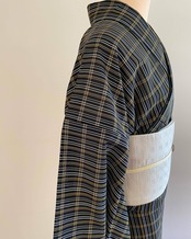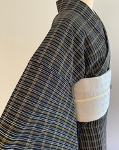 黒地に黄色と生成り色の長格子の十日町製と思われる夏黄八丈です。