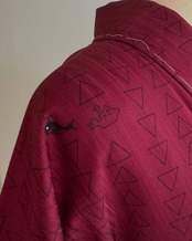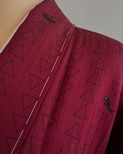 和色大辞典から葡萄色(えびいろ)に近い落ちついた赤系色の地となってます。線で表した三角を水の流れを感じるようにウェイビー配置してます。