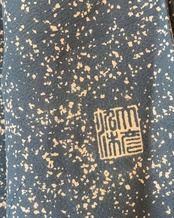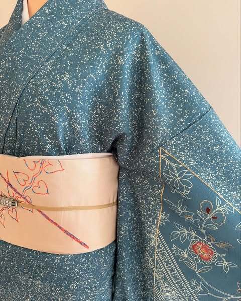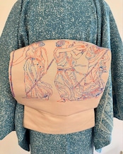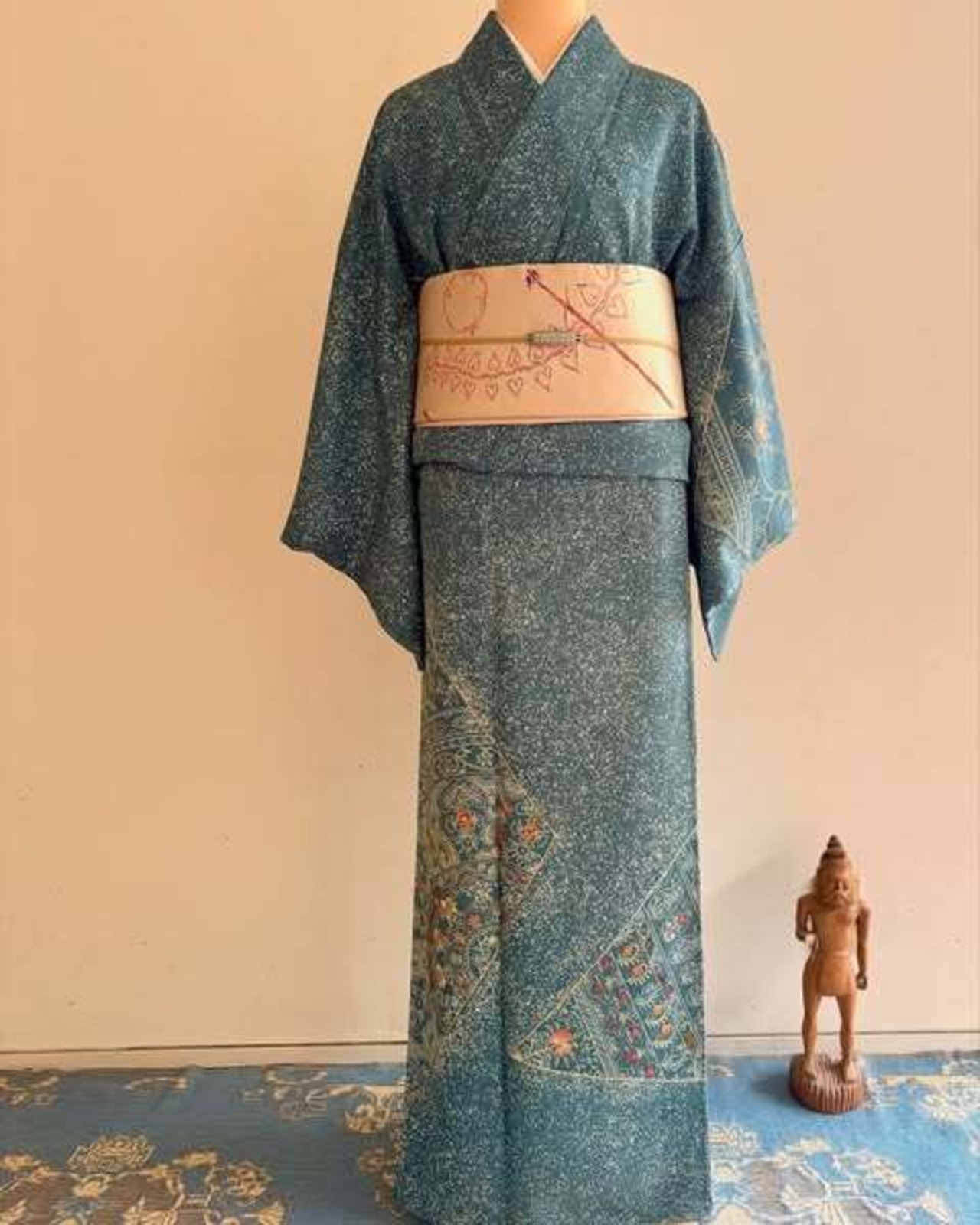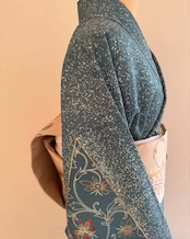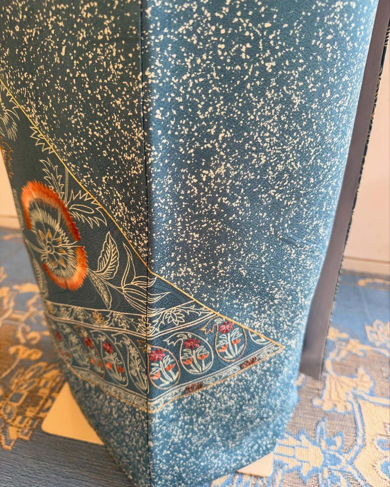 和色大辞典からなかなか近い色が見つけられません。微妙な青色にたたき染めを施し、抜いた無地場にアール・ヌーヴォーな柄を染と刺繍で控えめに表現した大変趣のある上品な一枚でございます。
